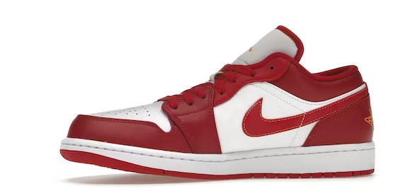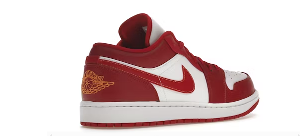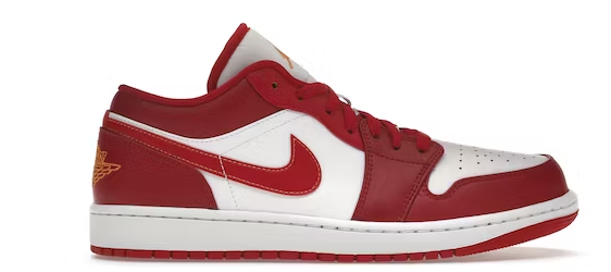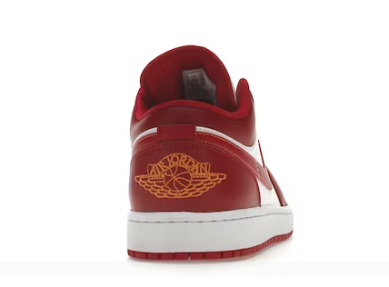 O Air Jordan 1 Low Cardinal Red tem cadarços vermelhos que ficam no topo de uma língua branca. O logotipo do sapato pode ser encontrado na parte superior da língua em vermelho.